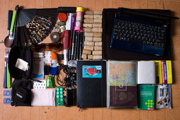2 gumki recepturki / zolty sznurek z blokadka / sznurowka w kolorach rasta / foliowa torebka pelna argentynskich monet (do autobusu), w sumie 26 peso / 250 chilijskich peso / 2 cienkopisy / welniana pacynka – baba / bombilla / pudelko z iglami do starych gramofonow / kapsel od boliwijskiego pilsnera / czerwony sznurek – usmiech / scyzoryk / matejka / w etui na aparat: aparat fotograficzny, 2 obiektywy, plyn, papierki, szmatki do czyszczenia aparatu, 2 filtry / czolowka / okulary korekcyjne w etui / okulary sloneczne w etui / metalowy piornik, a w nim: 9 pedzli roznych rodzajow i rozmiarow, 3 obsadki do piorek, 5 stalowek w tym jedna zlamana, biala kredka, czarna kredka, olowek, grafity do olowka, zyletka, 2 gumki – stara i nowa, 2 srubki od cyrkla, 1 metalowy nie wiem co to jest, ceramiczne korytko na farbe – cmielow / folia termiczna / zeszyt szkicownik / zeszyt dziennik / piekna teczka na kartki do komiksu, a w niej: 30 kartek szkicownika i 24 kartki akwarelowe / w skrytce czeki podrozne, kopie dokumentow i 140 dolarow / zapasowa foliowka / kluczyk made in china / korek od wina / kamyk pomaranczowy / 3 kamyki zielone / resztki breloczka z fistaszkow / stopery / 3 cukry z promu / 2 cukry nie wiem skad / ipod / telefon komorkowy / czysta plyta dvd / 190 bolivianos / dowod osobisty / karta kredytowa / aktualna czesc przewodnika.