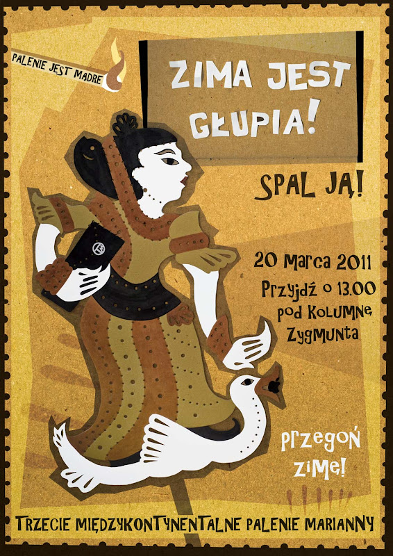 juz stare, slowianskie plemiona wiedzialy, ze wiosnie trzeba pomoc. poniewaz odrobina czarow, gusel i zabobonow jeszcze nikomu nie zaszkodzila, 21 marca, o 13.00, goraco zapraszamy nad wisle. zgarnijcie usmiech, znajomych, dzieci, psy i koty i przyjdzcie pod pomnik syrenki. kolejna, stworzona w ameryce marzanna, splonie w warszawie. bo przeciez… ta zima musi kiedys minac:)